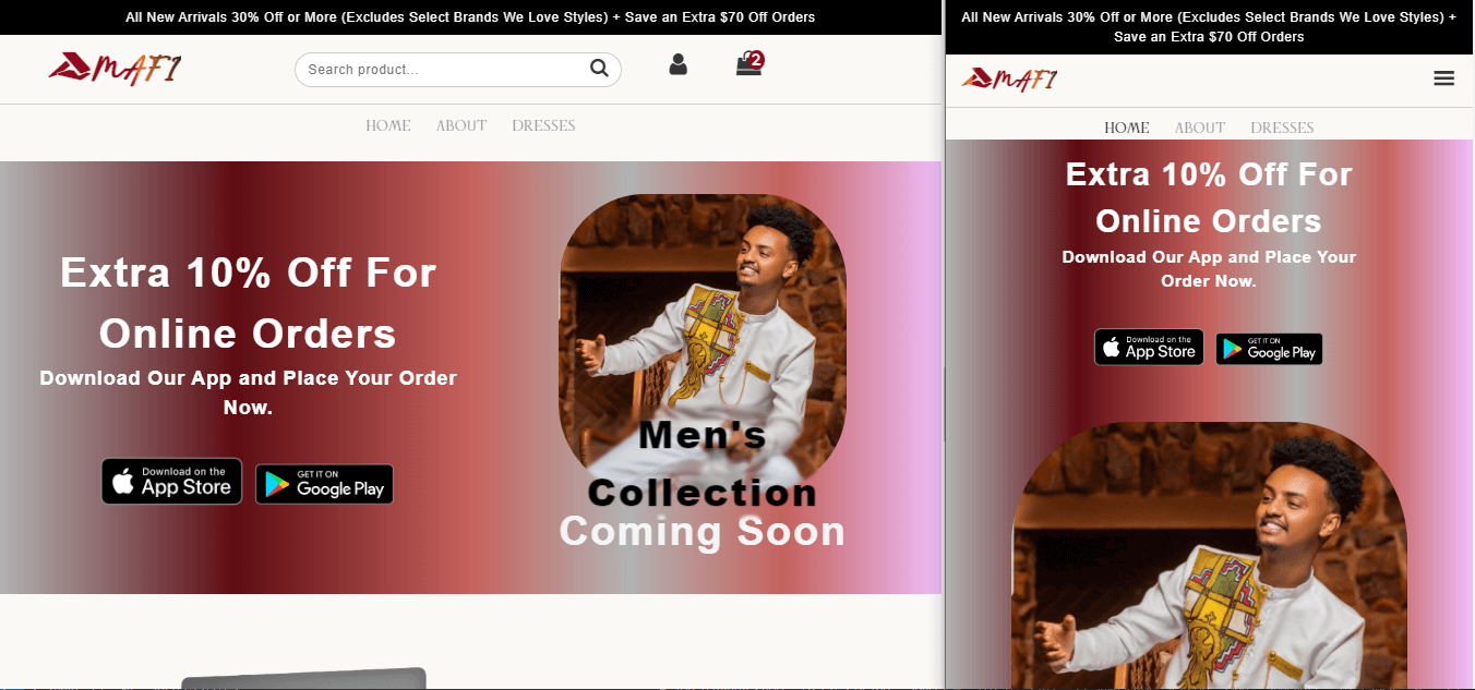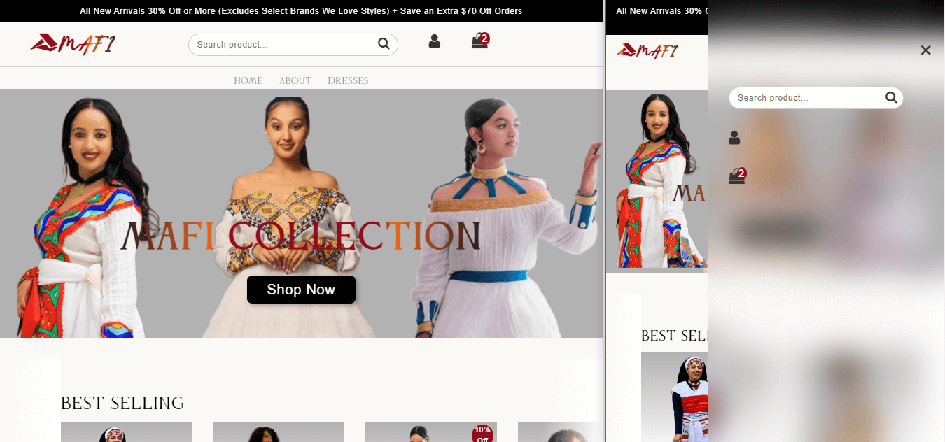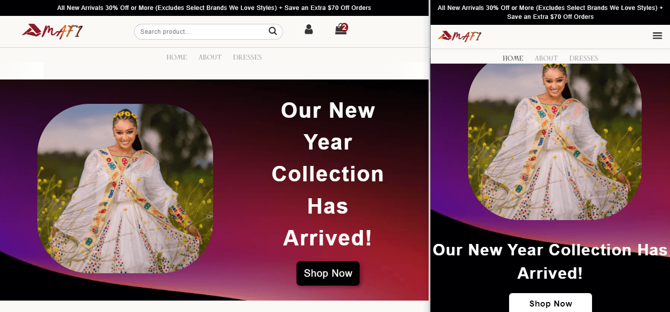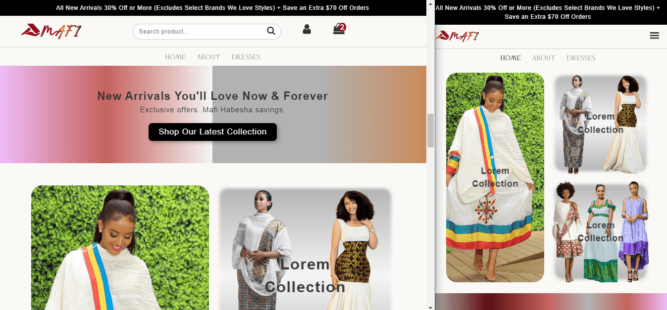 - Description: Mafi Habesha is a full-stack e-commerce website tailored for the retail sale of Ethiopian traditional dresses. It possesses three key features that enhance the overall shopping experience: a diverse collection of dresses, a user-friendly shopping cart service, and a responsive design that adapts to a wide range of screen sizes.