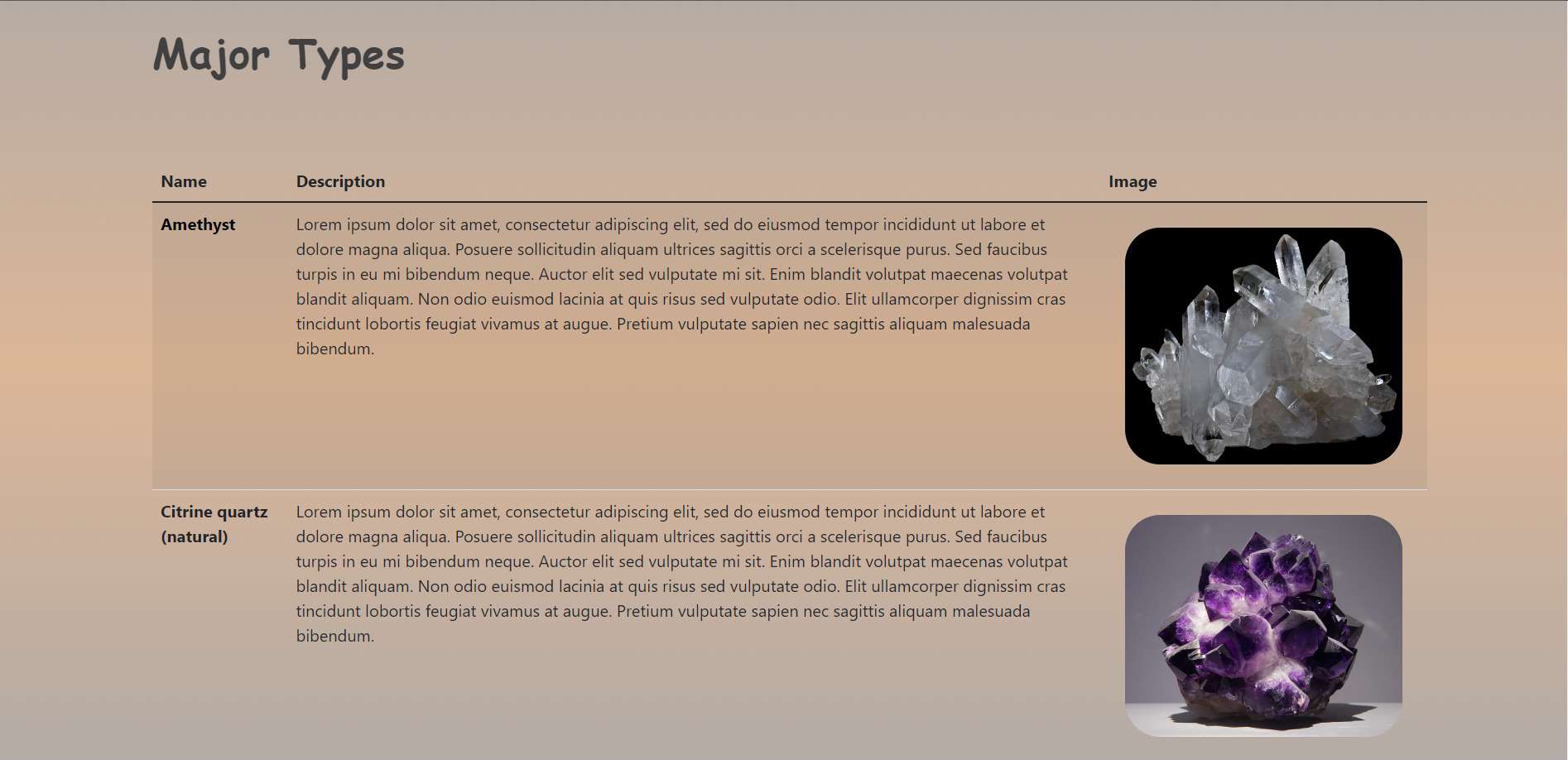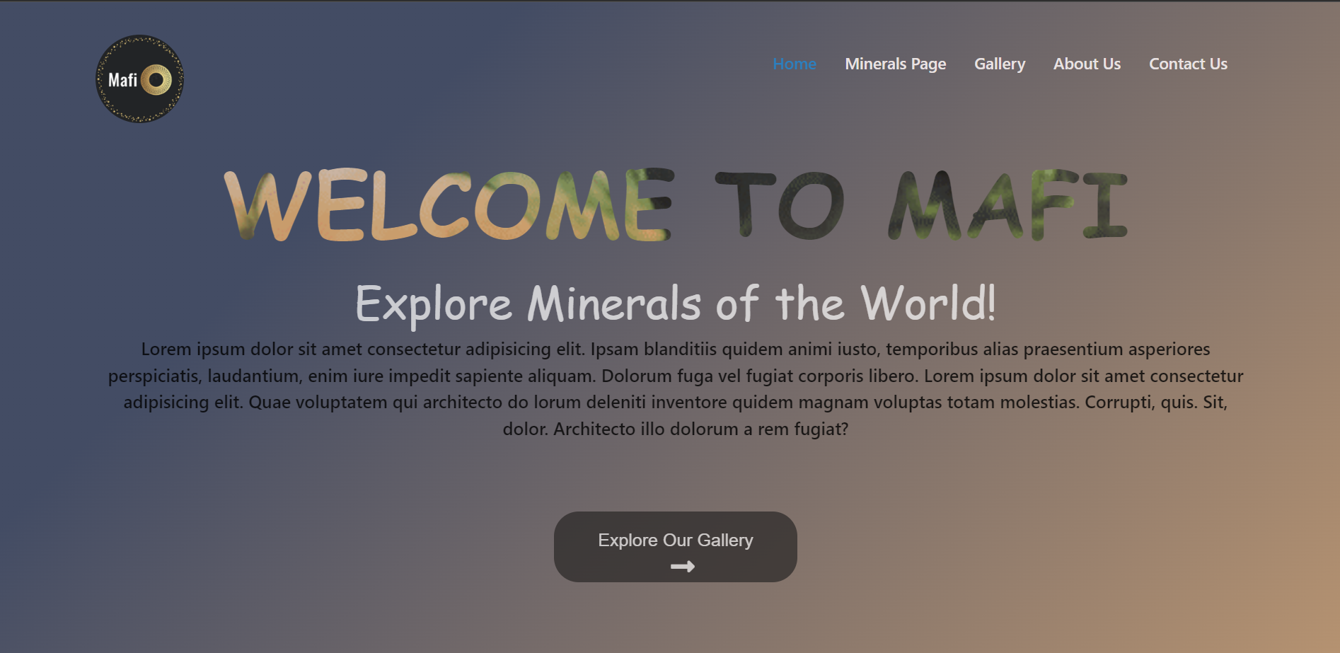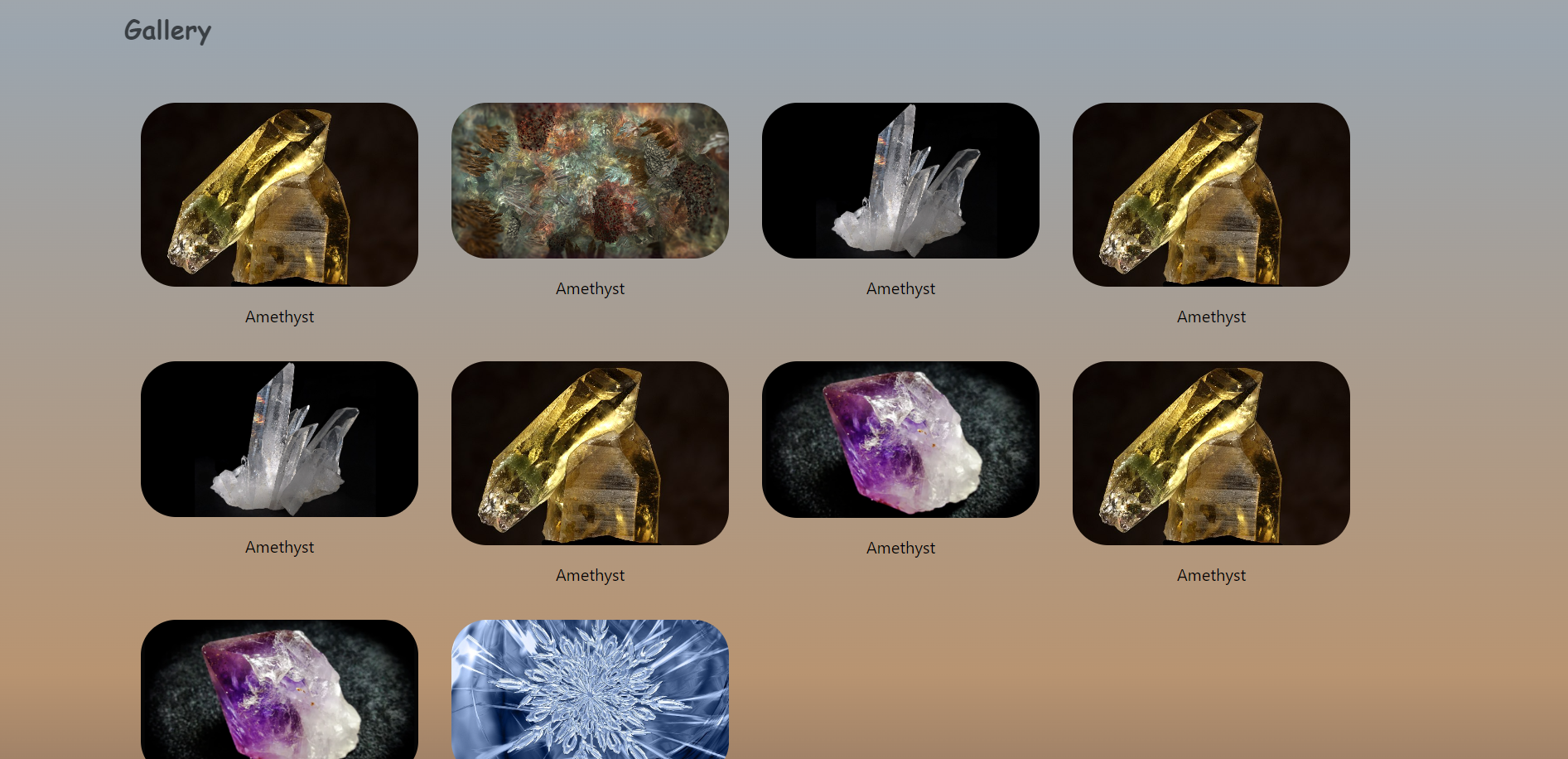 - Gallery Page: For a visually captivating experience, the Gallery Page showcases a variety of minerals. Users can explore these minerals through the image gallery, accompanied by detailed descriptions.