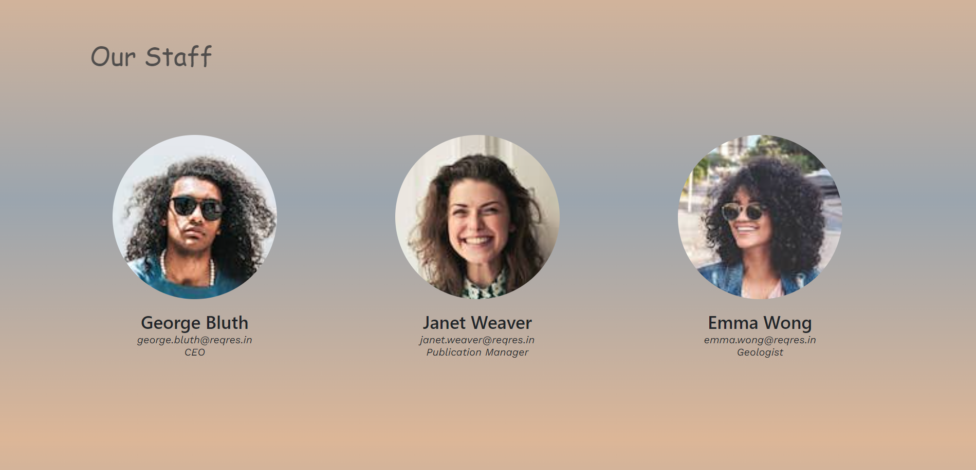- About Page: Delve into the heart of our organization on the About Us page. Here, we illuminate our mission, vision, and values, allowing users to gain a deeper understanding of our commitment to mineral education. Additionally, this page features an interactive staff directory, enriched by dynamic content sourced through API calls. This page also offers a membership option, allowing users to register through our user-friendly signup form.
