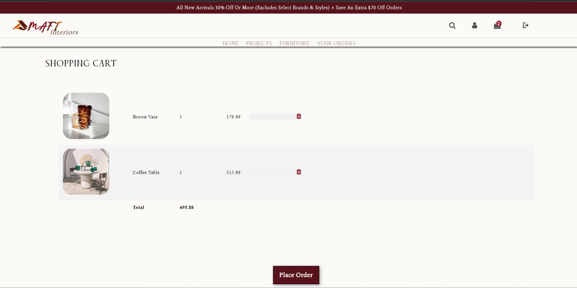 - Description: Mafi Interiors is a full-stack website encompassing a wide array of functionalities. This dynamic website combines a range of webpages designed to showcase interior projects, facilitate the sale of furniture, and empower administrators with the tools needed to efficiently manage the website.