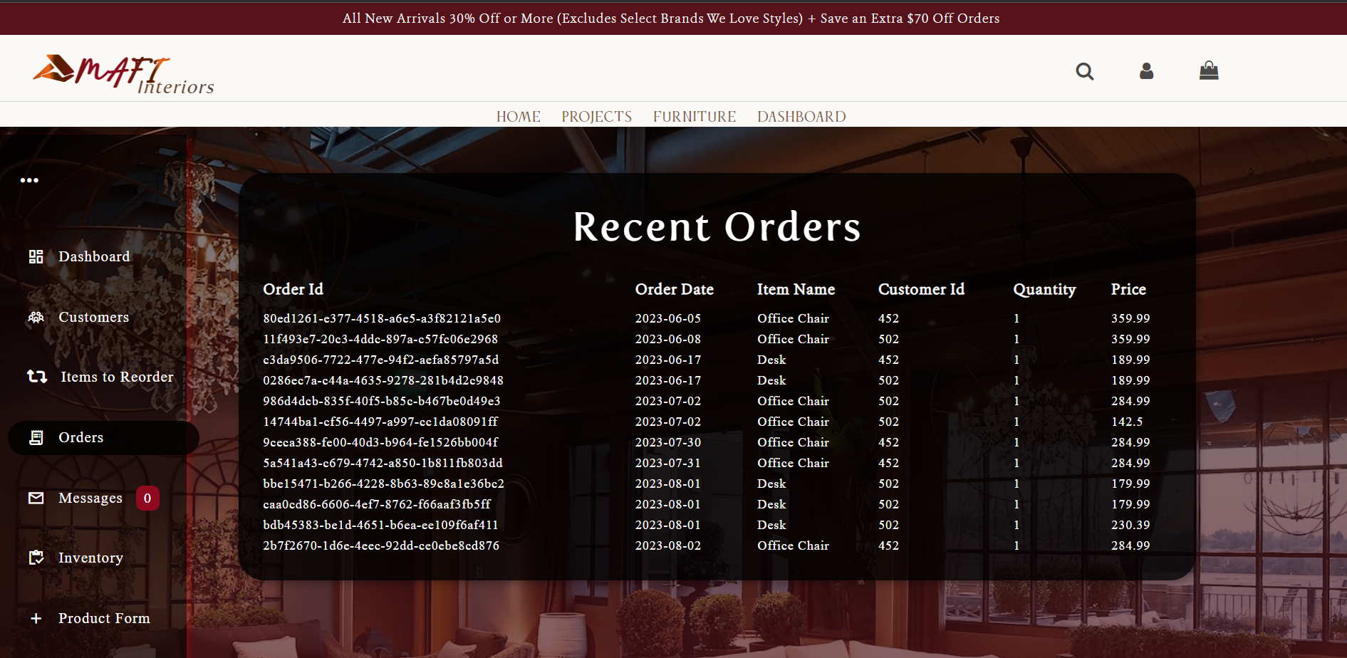 The third part of Mafi Interiors revolves around admin-centric functionalities. Admin users are directed to a dashboard page as they log in. This dashboard provides vital insights, including the total number of items sold, the cumulative order amount in USD, and a visually informative bar graph that depicts daily sales figures in USD. Admins retain control over the display of the data included in the dashboard, with the flexibility to customize the date range. Moreover, administrators have the following capabilities: