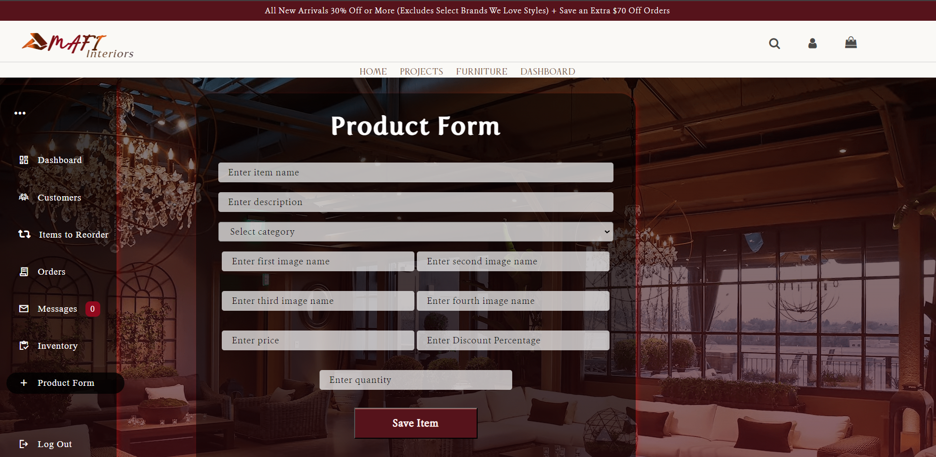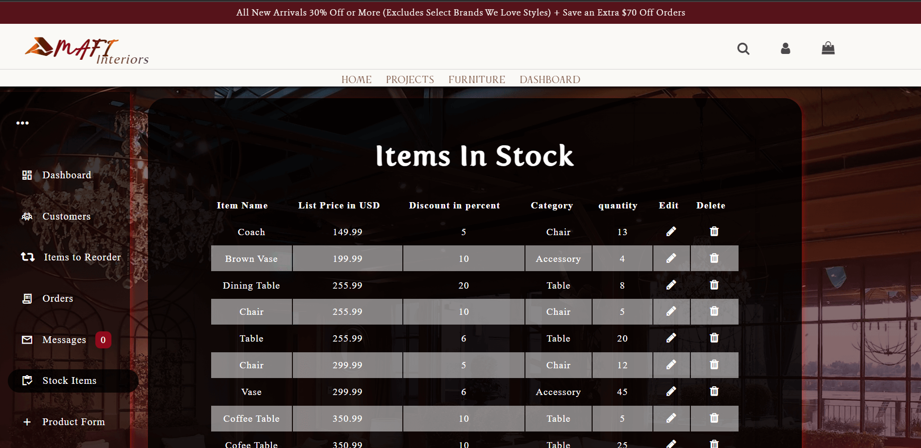 - Description: Mafi Interiors is a full-stack website encompassing a wide array of functionalities. This dynamic website seamlessly combines a range of webpages designed to showcase interior projects, facilitate the sale of furniture, and empower administrators with the tools needed to efficiently manage the website.